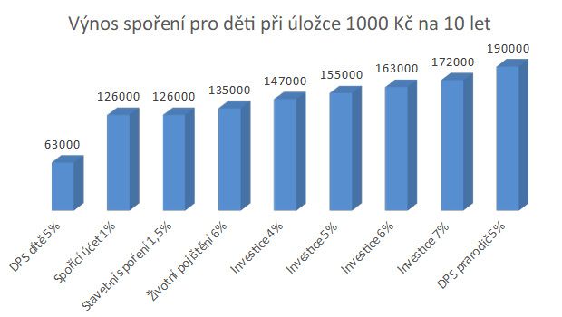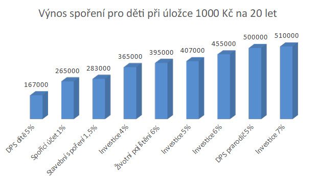 Již několik let tu máme nejnovější „hit“ ve spoření pro děti – Doplňkové penzijní spoření (DPS). Jedná se o nejlevnější způsob v ČR jak investovat peníze a vřele tento nástroj doporučujeme. Z našeho pohledu se ovšem jedná o naprosto nevhodný nástroj pro spoření dětem. Tedy, pokud jim nechceme spořit 65 let na důchod. Největší nevýhodu spatřujeme v tom, že u DPS je možné, aby si dítě v plnoletosti vybralo pouze 1/3 úspor. Pokud tedy chceme naspořit 300 000 Kč za 20 let, cílíme na částku 450 000 Kč (po započítání inflace) a těch 450 000 Kč je právě naše třetina, kterou potřebujeme na studia dítěte. Takže, aby to mělo smysl, bylo by zapotřebí za 20 let naspořit cca 1,4 mil. Kč. Další velkou nevýhodou je již zmíněné vlastnictví takových rezerv – smlouva je psaná na dítě.